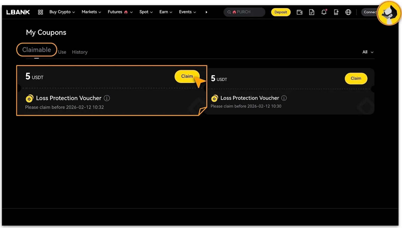 Redemption Entrance 1:Navigate to「Personal Center」>「My Coupons」>「To Claim」, then locate and activate the voucher by clicking「Claim」.
