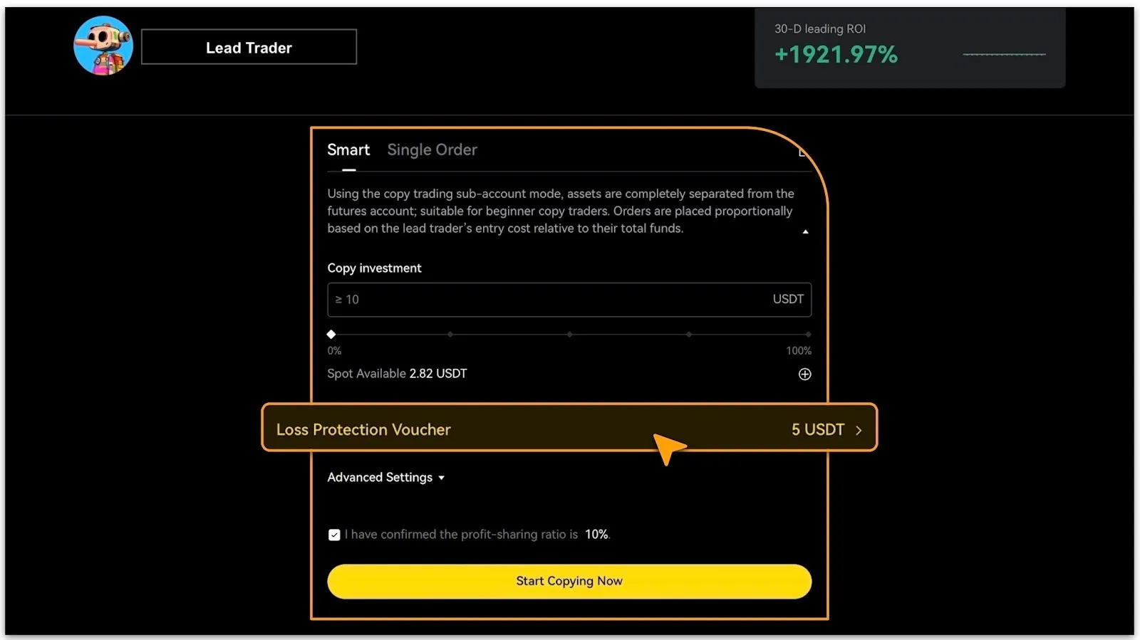 After activating the voucher, enter the Copy Trading page. The system will automatically match the most suitable available voucher based on your selected trader, trading pair, and investment parameters (prioritizing those with larger face values and earlier expirations).
